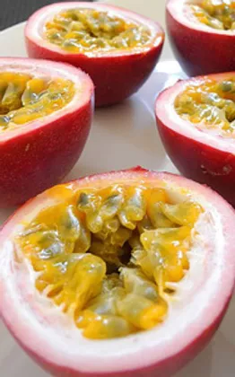 Varieties: Edulis Appearance: Deep purple, slightly oval Hard non-edible outer skin. Have juice sacs inside surrounding each of the numerous seeds Seasons: All year round.